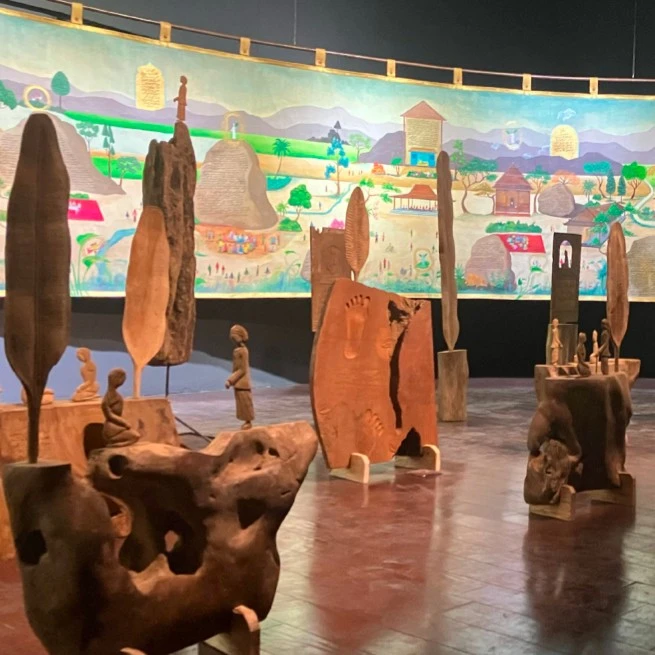 Judul lengkap karyanya Endog Jagad: Serat Nubuwat Kiai Jembar Manah. Karya ini dibuat oleh Faisal Kamandobat, seniman asal Cilacap, Jawa Tengah. Ia menghadirkan instalasi multidimensional ini sebagai “kitab” pengetahuan yang enggak berhenti pada keindahan visual aja, tapi juga menyatukan pengalaman spiritual, kosmologis, ekologis, dan juga sosial.