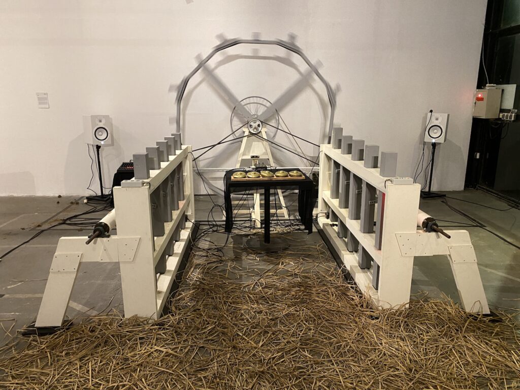 Sekitar 500 meter ke utara, venue Gubug Putih menyambut dengan suasana yang sama hidupnya. Di tengah kolam kecil, sebuah cerobong berdiri tegak mengeluarkan struktur bebunyian tertentu. Instalasi ini adalah Spektralieri, karya Fioretti Vera. Ia menerjemahkan aktivitas memasak ibu-ibu KWT Sawit, Desa Panggungharjo, menjadi simfoni suara yang berasal dari denting wajan, irisan sayur yang jatuh, serta tawa dan obrolan ringan antar mereka. Semua direkam, lalu dihidupkan kembali lewat cerobong itu.