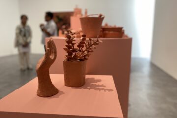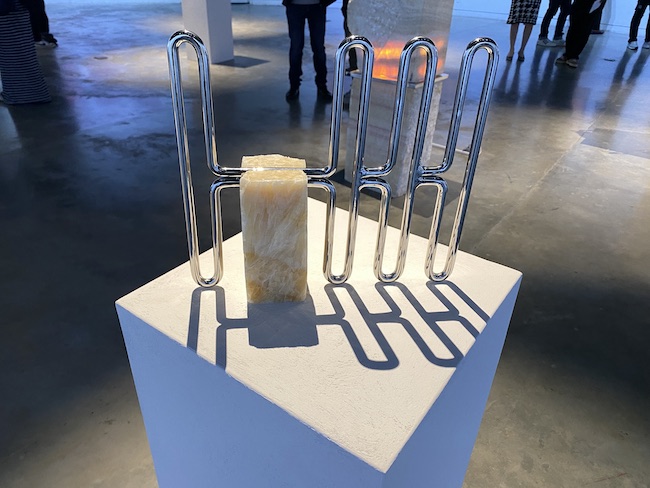 Di tengah ruang pameran, Gabriel Aries menyajikan kontras yang mencolok melalui material-material keras dan tegas: logam, batu, resin. Dalam menanggapi tantangan ruang pamer, Gabriel tidak hanya menempatkan karya-karyanya, tetapi menjadikan cahaya sebagai elemen pahat yang setara dengan material fisik lainnya.