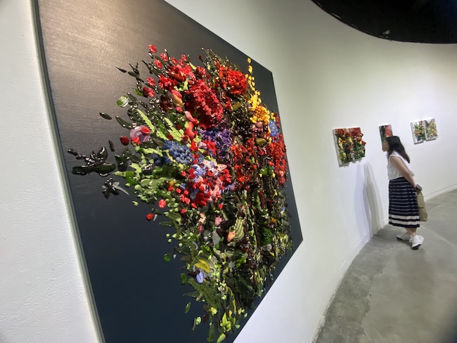 Begitu memasuki ruang pamer, pandangan langsung tersita oleh sebuah lukisan yang bentuknya seperti representasi buket bunga yang sedang meledak dalam dinamika yang membeku. Ini adalah karya Reggie Aquara dari seri “Painters Bouquet”. Sebuah kanvas persegi dengan latar belakang hitam pekat yang menyediakan panggung kontras dramatis, membuat elemen utamanya—sebuah massa bunga yang padat—menjulang secara nyaris brutal.