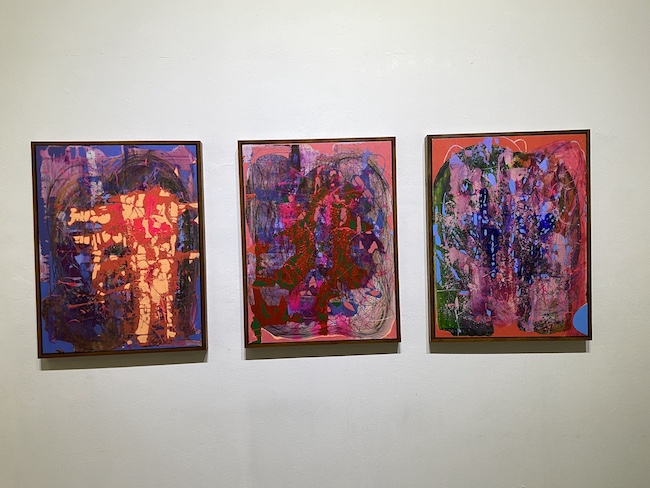 Di lukisan lainnya, latar belakang merah muda keunguan yang lebih lembut menyangga massa bentuk utama berwarna merah tua, ungu, dan hijau gelap yang saling berpadu. Bentuknya mengingatkan pada organ tubuh atau awan yang bergolak, dengan coretan-coretan halus dan sapuan kasar yang memberikan tekstur berlapis. Elemen pink dan biru muda hadir sebagai penambah kontras, menciptakan kesan yang lebih introspektif dan tidak seekstrim lukisan sebelumnya.