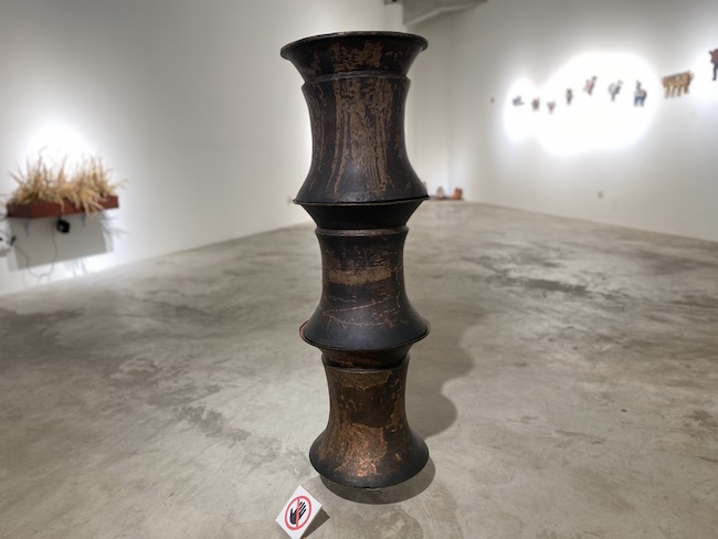 Begitu memasuki ruang pamer, mata saya langsung tertambat pada sepasang kaki terakota di sudut ruangan. Kaki-kaki itu terpancang di gundukan tanah, dikelilingi fragmen keramik pecah berwarna coklat kelabu. Detail tekstur kulitnya halus, tapi retak-retak alami membayangkan usia panjang. Posisinya yang condong ke dinding beton dan lantai dingin menciptakan kontras tajam. Tubuh dan tanah menyatu dalam narasi sunyi.
