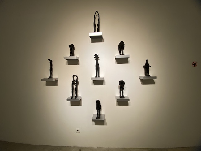 Tak hanya di lantai galeri, narasi tentang tanah merambat naik ke dinding. Di sana, serangkaian patung abstrak berwarna gelap hadir. Replika kaki manusia terfragmentasi ini masing-masing bertengger di rak kayu mini yang disusun melingkar. Ada yang realis; ada yang distilasi hingga nyaris biomorfik; bahkan beberapa dihiasi “tumbuh-tumbuhan” aneh.
